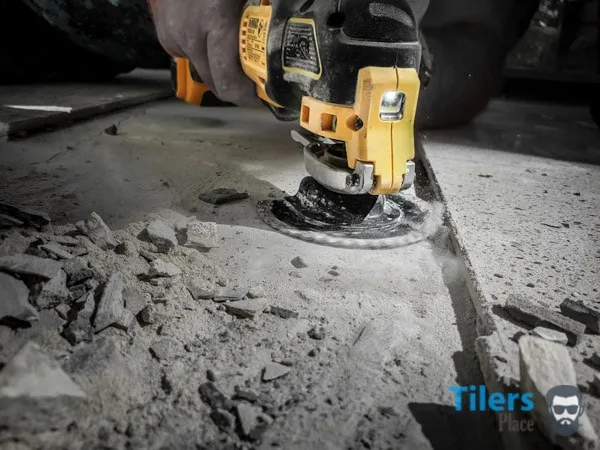 Start off by removing any specs of old grout that may have remained during your tile removal. There is usually blobs of it on the substrate. If you grabbed the DeWalt grout removal blade, you can use the flat side of it to grind away the grout and even thinset! It’s absolutely fantastic and much safer than chipping grout off with a chisel.