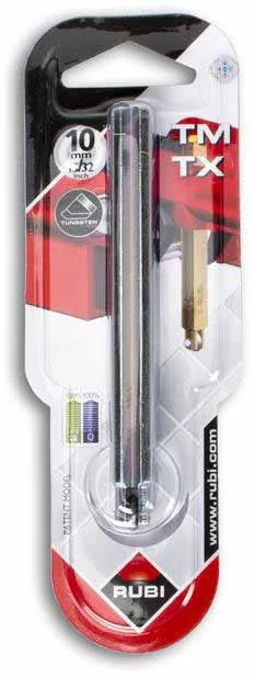 These are specially machined rods that slot into a Rubi tile cutters handle section and tightened in place. The scoring wheel is made from hardened tungsten carbide and can score the surface of any tile including glass.