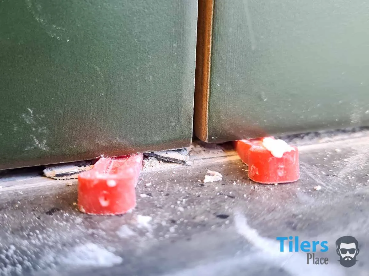 The next method is the “projection method” or tombstone style and it’s similar to using match sticks. Instead of sliding the spacer into the intersection of the tile, you just use one of the spacer protrusions and leave the rest of the spacer in the air. This method is used when you got a tile against the wall. Obviously you can’t fit the whole spacer in there as there’s no room so just use one end. It’ll still create an even gap.